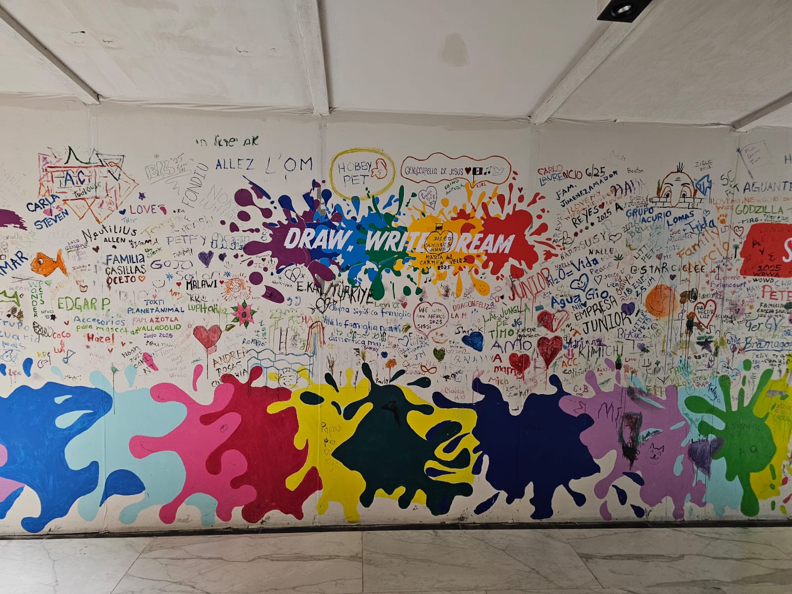 La idea era que el mural llamara mucho la atención, sobre todo la de los niños, ya que el lugar está lleno de familias. Por eso se optó por usar muchos colores vivos y contrastantes. Para lograr eso, diseñé una base con grandes manchas de colores colocadas en la parte inferior de la pared. La zona central —donde está la frase “DRAW. WRITE. DREAM.” y varias salpicaduras de colores— no fue pintada directamente, sino que se colocó con vinil impreso para asegurar que el mensaje principal se viera limpio y profesional, y también para ahorrar tiempo de ejecución.