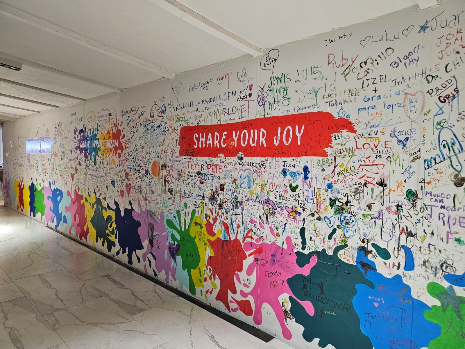 Aunque sabía que el mural iba a desaparecer junto con la pared, fue un proyecto que disfruté muchísimo. Me encantó ver cómo un diseño puede servir como punto de encuentro y participación, incluso si es algo temporal. Fue una forma de transformar una pared cualquiera en un recuerdo colectivo lleno de color, cariño y creatividad.