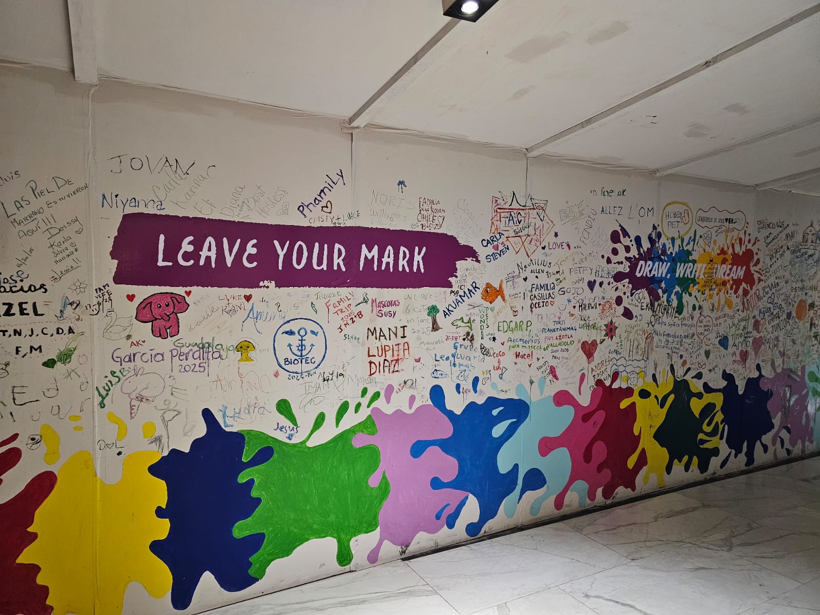 Después de montar el vinil, el resto del mural quedó completamente libre para que la gente pudiera intervenirlo. Poco a poco, los clientes comenzaron a dejar sus nombres, dibujos, frases, garabatos, firmas y hasta dedicatorias. Fue increíble ver cómo las personas, especialmente los niños, se emocionaban al poder dejar su huella en un espacio pensado para ellos.